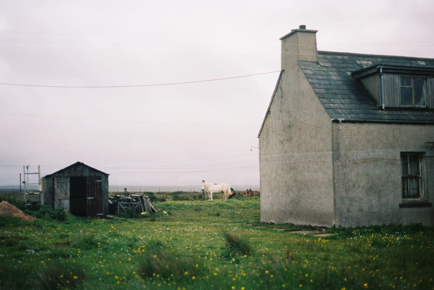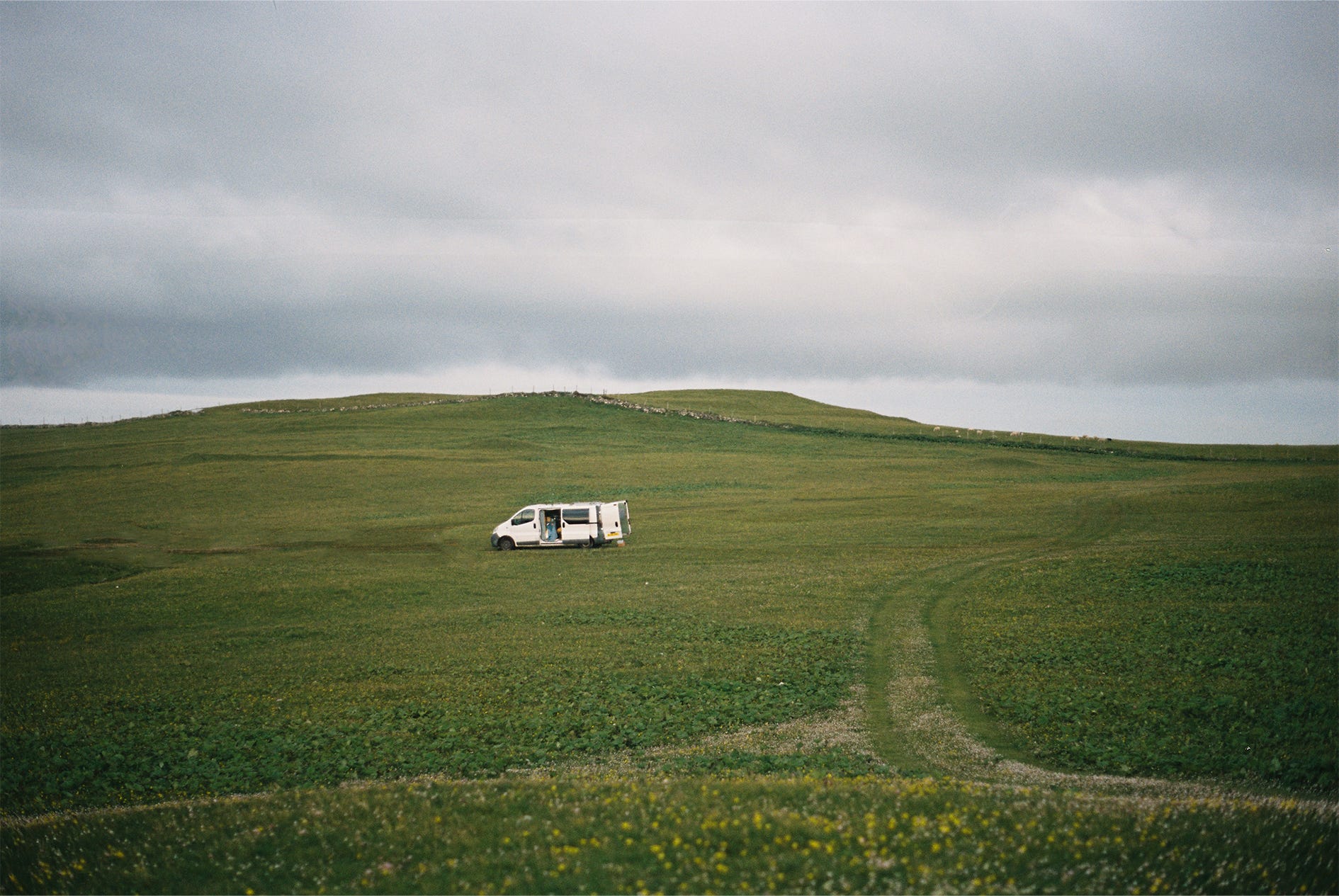 I turn into a meadow off the road and park my van where it feels right. There are few edges here, no spaces to slot into perfectly. The fields here don’t seem to have fences or hedges which act as boundaries; the land runs free. It forces a confidence out of me. I run outside, towards the edge of the cliff. It isn’t high—Lewis is low lying. I climb down onto the sand. Jump across the rocks. Lewis has taught me that being alone is not loneliness and it has taught me how to find home within myself. From the edge of the cliffs, I turn back to face the van, tiny in the expanse of green. I walk back to it, noticing the yellow flowers I pass, hoping the camera will pick them up. When I’m back, I nap with all the doors wide open, falling asleep to the view, the sound of the cooling wind, the relentless wind.